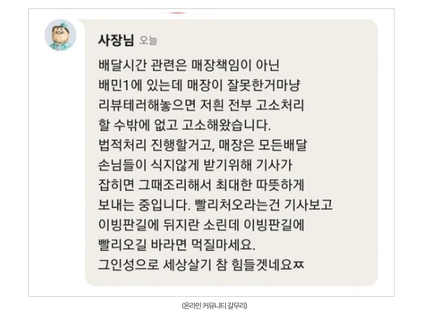 고객님 리뷰에 고소드립 하면서 답변 쓰는 사장질 하는 인간들 때문에 배달 이미지 다 버리고 있다.