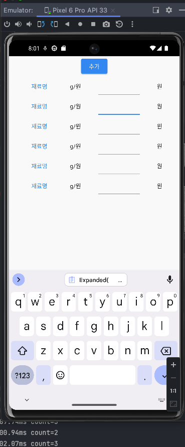재료 합산 페이지를 만들기 위해 버튼을 누르면 리스트 안에 위젯들이 추가 되는 기능을 구현하고 싶었다.