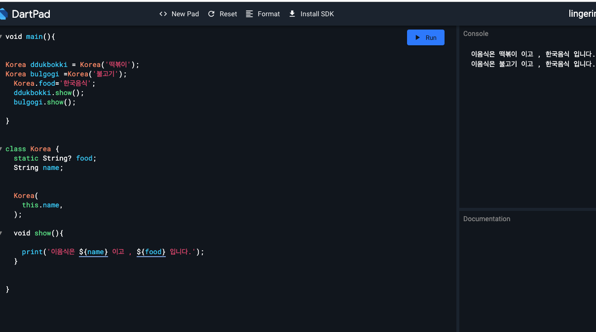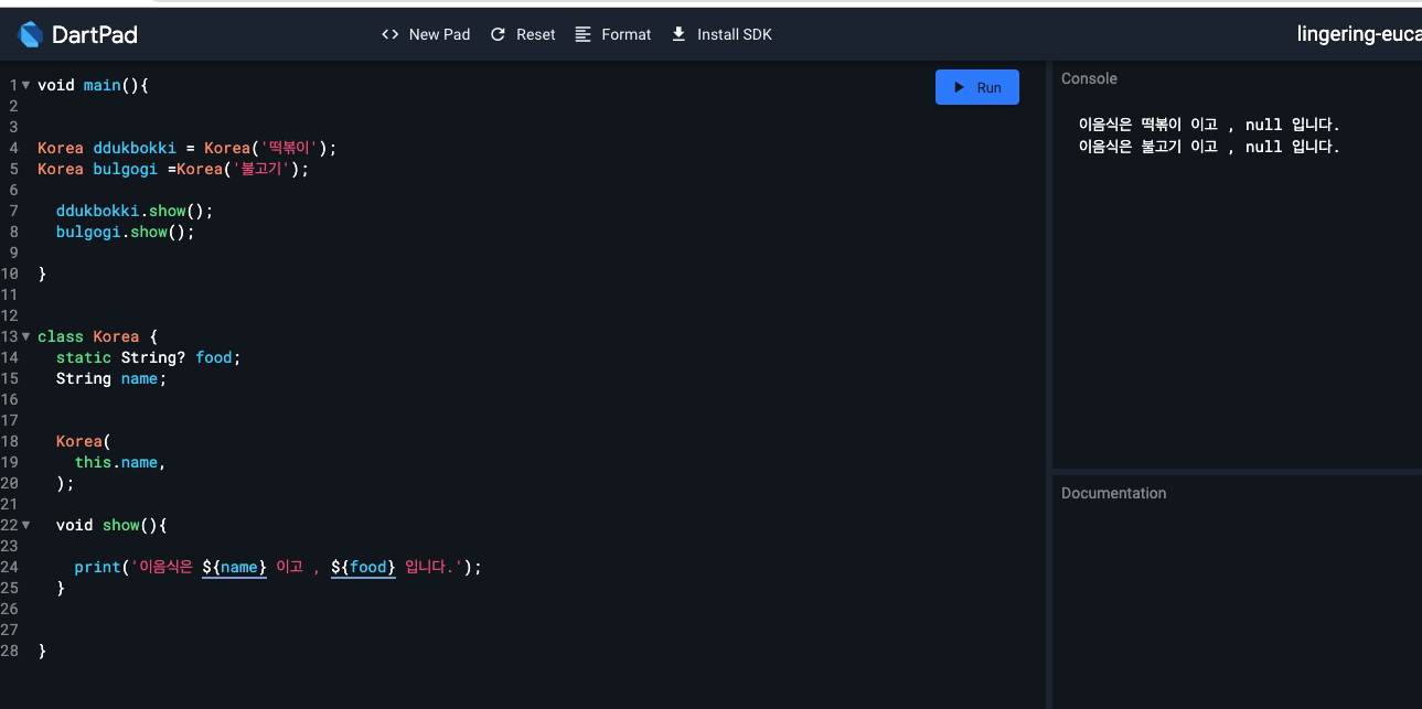 그러면 하나의 코드로 여러 인스턴스인 떡볶이와 불고기에 "한국음식" 이라는 값이 잘 들어오는 게 확인이 된다!