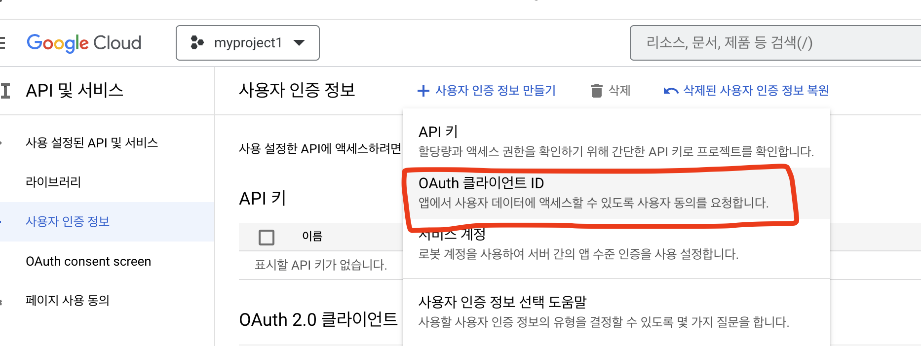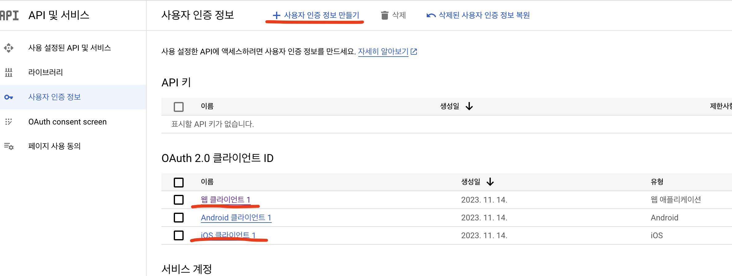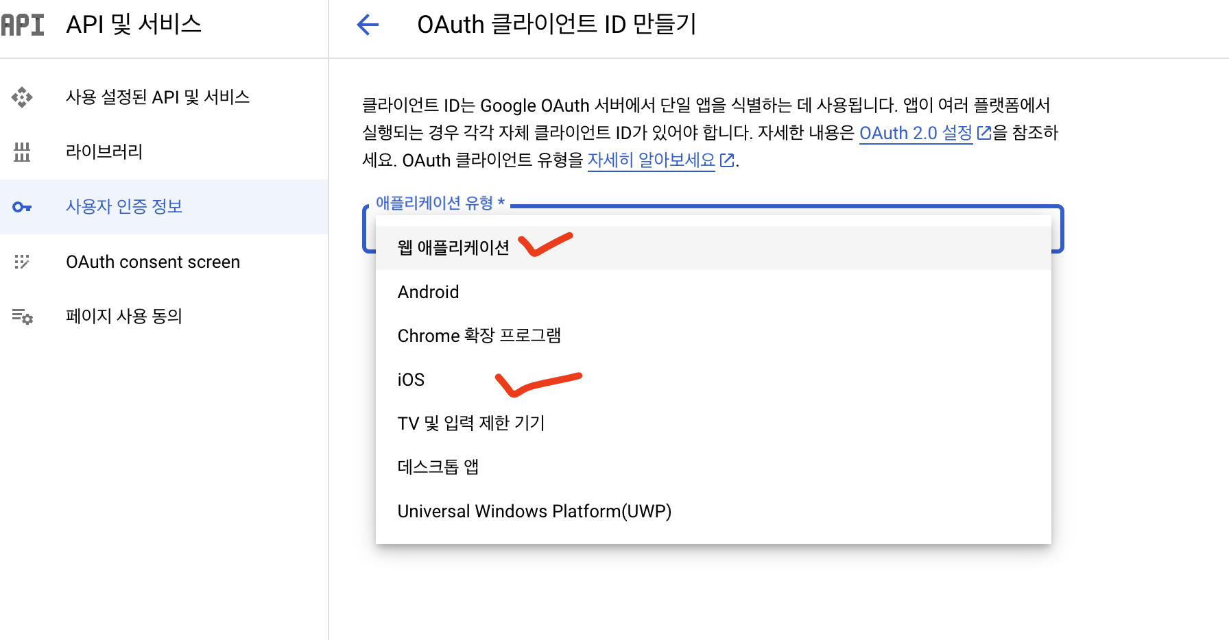 Oauth 클라이언트 ID 만들기에서 웹 애플리케이션과 ,안드로이드 ,IOS 3가지만 만들어 줍니다.