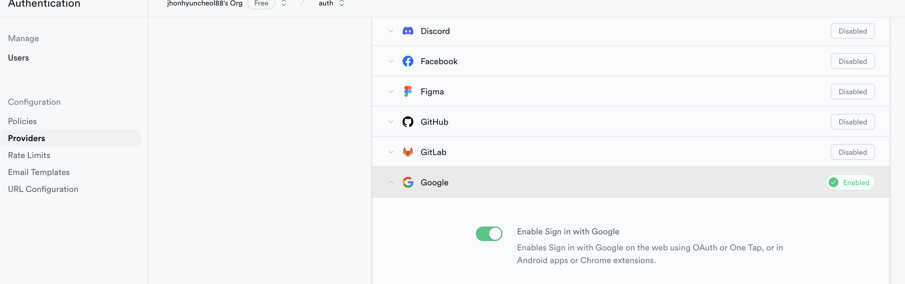 supabase 프로젝트 Authentication 에서 Auth Providers 페이지로 넘어갑니다.