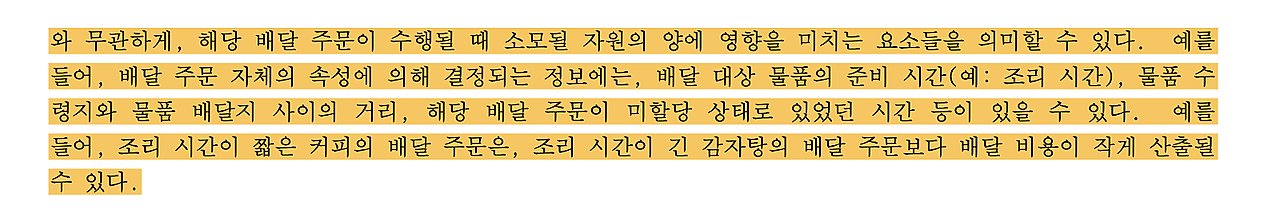 매장과 해당 매장에 주문한 고객의 거리가 그렇습니다. 즉 배달기사가 물품 수령 후 배송완료까지의 시간은 관리 할 수 없지만 다른 조건들은 충분히 관리 할 수 있습니다.