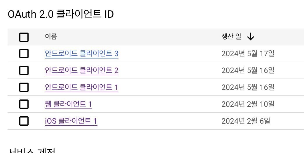 유효한 SHA1 키가 아니기 때문에 뱉어나는 문제이다. 즉 위 3가지 SHA1 키를 정확하게 구글 클라우드나 파이어베이스에 입력해야 한다. 파이어베이스에서는 SHA1 키를 입력만 하면 되지만 구글 클라우드에서는 해당 인증 id를 하나씩 만들고 SHA1 키를 입력해야 한다.