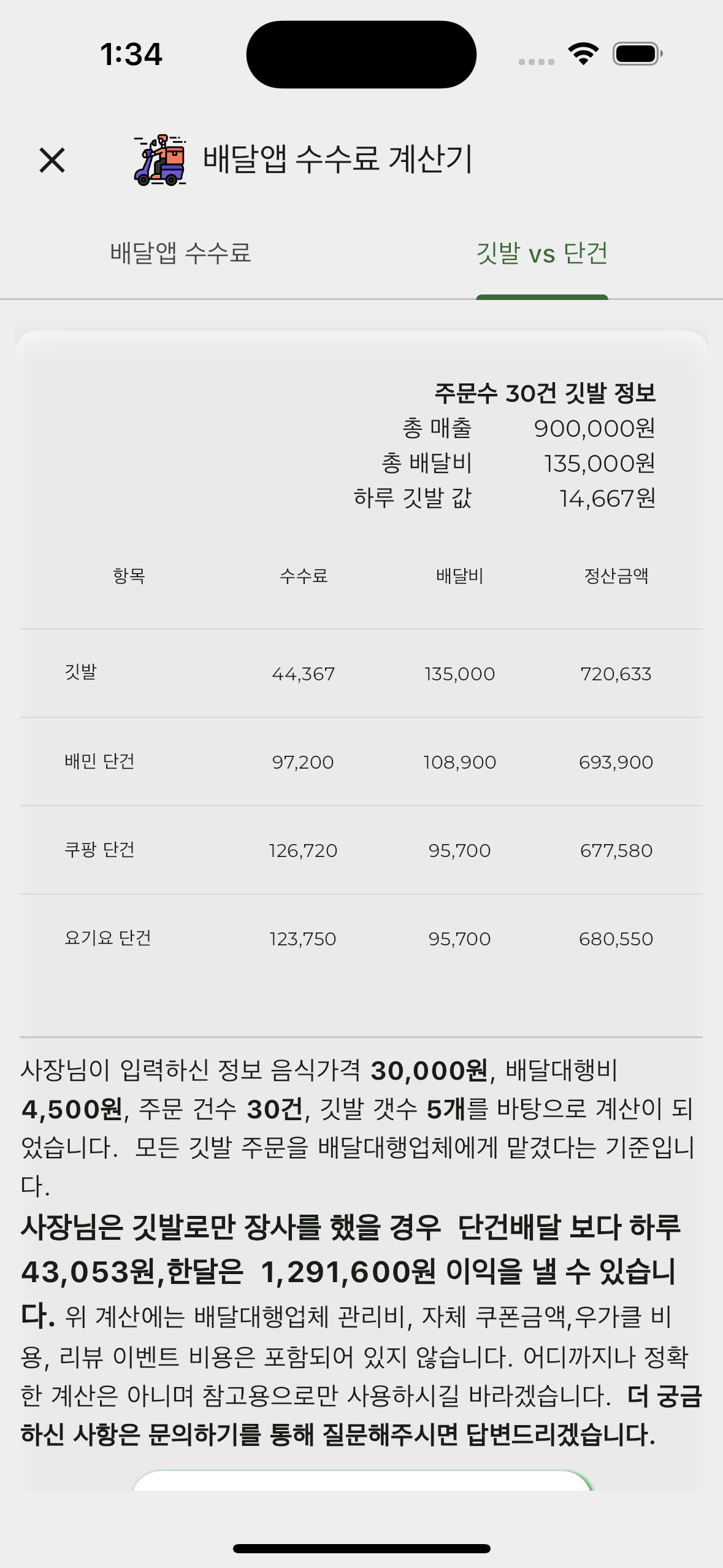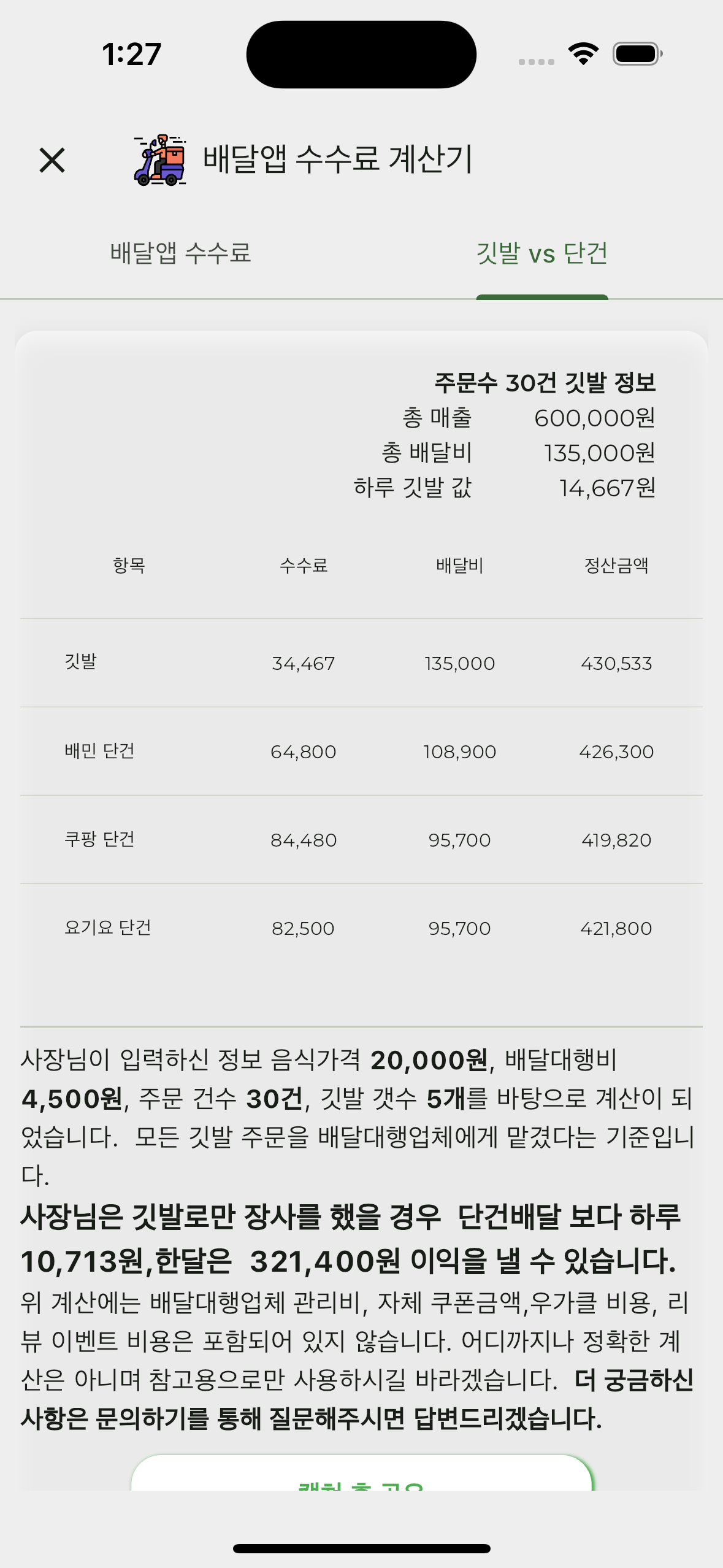위 계산기에는 여러 상황들이 없습니다. 대표적으로 단건배달의 서비스 부족이 그렇습니다.