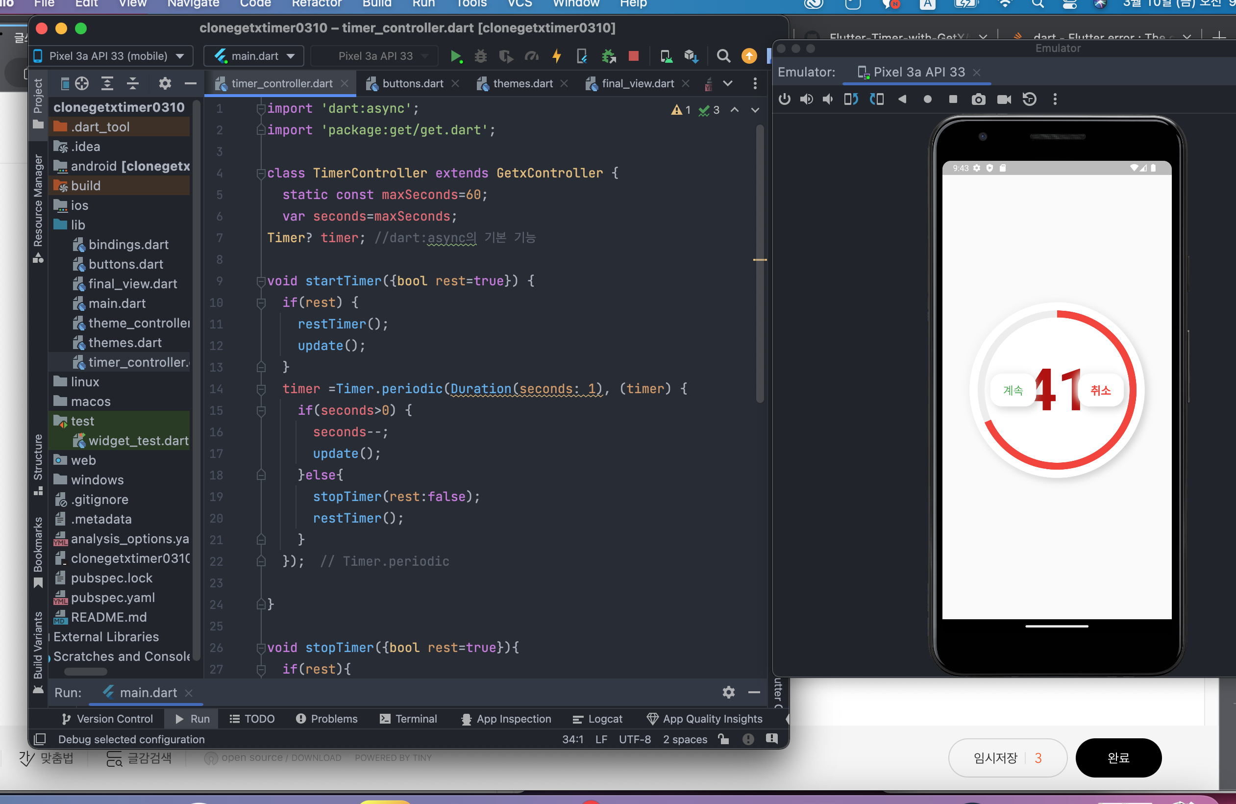 1. 상태변화에 대해서 update()함수를 사용했고 , 그것을 보여줄 때는 Getbuider를 쓰는 법을 배웠습니다. (하지만...변수에 .obs 사용이 더 편한 듯..)