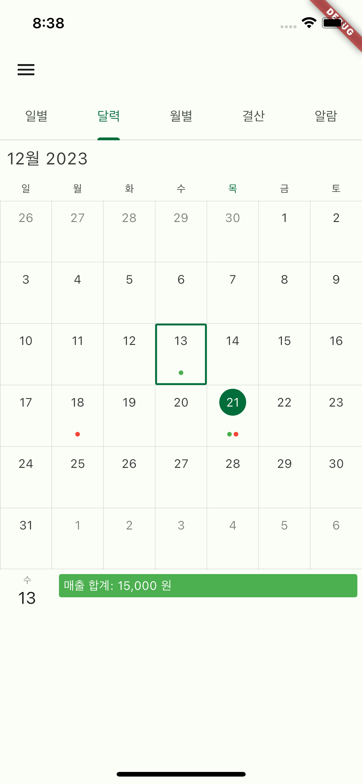 달력 내부에 매출의 합,지출의 합을 보여줄까도 했지만 숫자가 많아지면 지저분하게 보이게 되어서